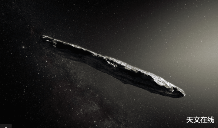 图解:一个艺术家的作品,展示了小行星奥默默(以第一个拜访太阳系的天外来物身份而闻名的星际天体)图源 :M. Kornmesser / 欧洲南方天文台